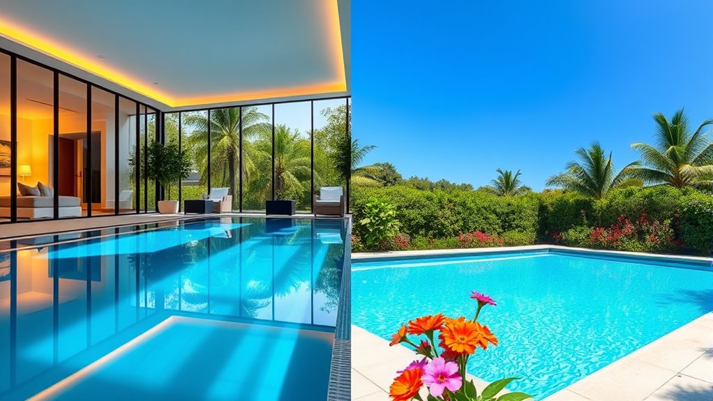 Maintaining an indoor pool generally requires less effort because it’s protected from the elements, reducing exposure to dirt, debris, and weather-related wear. With fewer contaminants entering the water, you’ll spend less time skimming and cleaning. Indoor pools also have more stable temperatures, which helps maintain water chemistry and reduces the need for frequent adjustments. Additionally, using comfort solutions such as high-quality filters and automation systems can simplify maintenance tasks. However, you’ll still need to monitor chemical levels regularly, keep the area well-ventilated to prevent mold, and clean filters periodically. Outdoor pools, on the other hand, face more challenges, including leaves, dirt, and weather elements that increase cleaning and chemical balancing. They also require cover use when not in use to minimize debris buildup and potential algae growth. Proper maintenance is essential regardless of location, but indoor pools tend to demand less frequent attention.