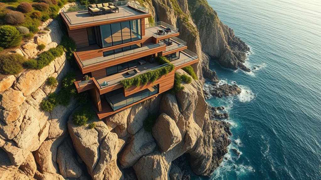 You can rest assured that these cliffside homes withstand harsh weather by using durable, weather-resistant materials like reinforced concrete and treated wood. They’re built with strong foundations that anchor them securely, even during storms or high winds. Additionally, advanced insulation keeps interiors comfortable. Proper drainage systems prevent water damage, and strategic design features like windbreaks and protective barriers help these homes endure extreme weather conditions while maintaining safety and stability.