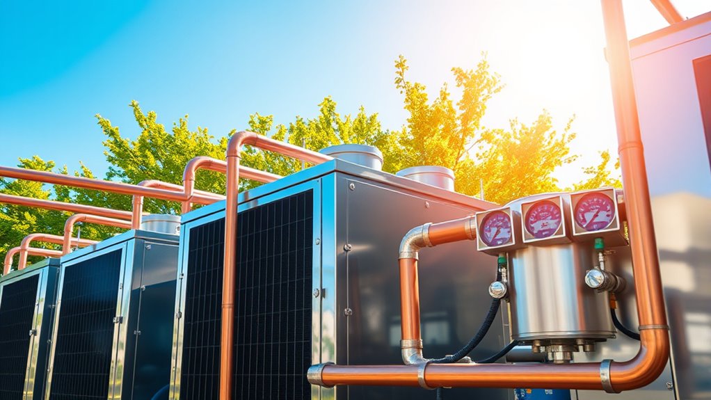 Implementing energy-efficient practices and cost-saving strategies can substantially reduce your cooling system’s long-term expenses. First, consider upgrading to high-efficiency chillers that consume less energy while providing the same cooling capacity. Second, optimize your system’s operation by installing programmable thermostats and zoning controls, so cooling is directed only where needed. Third, invest in insulation and shading around your facility to reduce heat gain, easing the load on your cooling system. These steps not only lower your energy bills but also extend the lifespan of your equipment. Additionally, ensuring proper system maintenance can improve efficiency and prevent costly breakdowns. By focusing on efficiency and strategic management, you’ll achieve significant savings while maintaining ideal cooling performance during hot summer months.