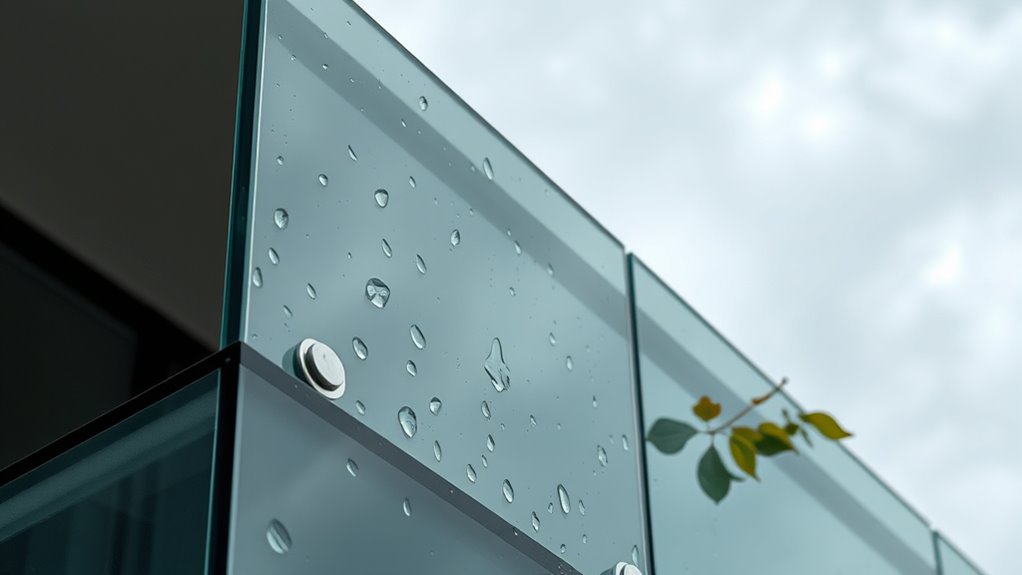 Environmental pollutants can markedly shorten your glass railing’s lifespan. They cause surface corrosion, staining, and etching, especially from acids and chemicals in pollutants like acid rain, bird droppings, and industrial emissions. Over time, these contaminants weaken the glass and hardware, making maintenance essential. Regular cleaning and protective coatings help mitigate damage, ensuring your glass railing remains durable, clear, and safe for years to come.