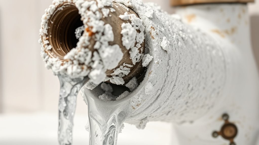 When mineral deposits accumulate on pipes and fixtures, water flow can become considerably restricted. This buildup narrows internal passageways, reducing water pressure and flow rate. As scale thickens, you might notice slower drains, weaker showers, or increased wait times. To understand the impact better, consider these key issues:
