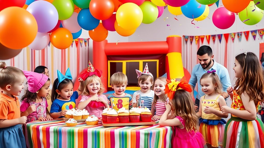 When planning kids’ parties, choosing activities that match the age group is essential for guaranteeing everyone has fun and stays safe. Younger children, like preschoolers, enjoy simple games such as duck-duck-goose or a treasure hunt with easy clues. They thrive on activities that are colorful, interactive, and short in duration to hold their attention. Older kids, like preteens and teenagers, prefer more challenging and energetic activities such as relay races, scavenger hunts, or arts and crafts projects. Tailoring activities to your guests’ age ensures they stay engaged and avoid frustration or safety hazards. Always consider their developmental level and interests, and keep the activities easy to understand and execute. This way, everyone stays entertained and safe throughout the celebration. Incorporating appropriate developmental milestones into planning helps ensure activities are suitable for all ages.