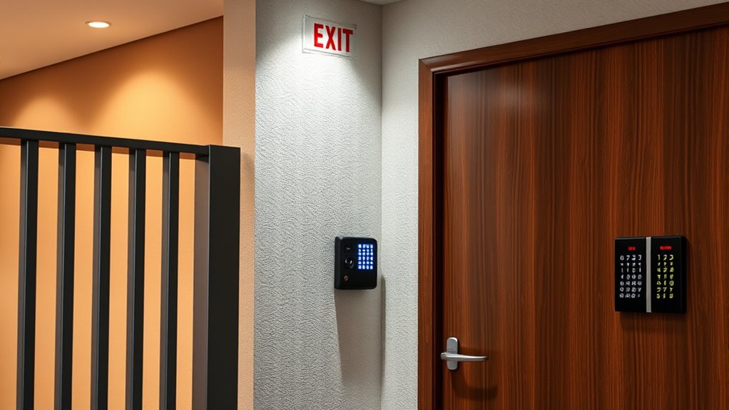 To prioritize safety, install strong physical barriers like fences, gates, and bollards to control access and prevent vehicle intrusions. Use security alarm systems with motion sensors, door contacts, and alert options to detect intruders quickly. Manage your access codes carefully by choosing unique, updated combinations and avoiding sharing them with untrusted individuals. Properly maintaining these safety measures guarantees they work effectively, and if you stay informed, you’ll discover even more ways to protect your home and loved ones.