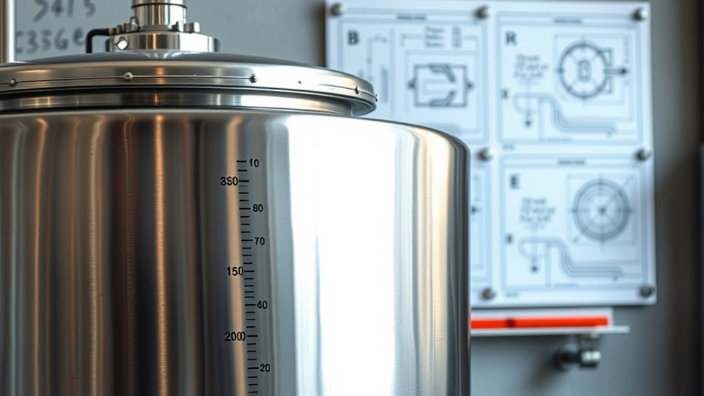 Think of safety margins as your system’s gentle cushion. You should size your surge tank with a little extra capacity—about 10-20% more than your typical flow demands—to accommodate unexpected surges or fluctuations. This guarantees smooth operations and protects your equipment. By providing this buffer, you create a reliable system that gracefully handles surprises, giving you peace of mind and maintaining efficiency even during unforeseen events.