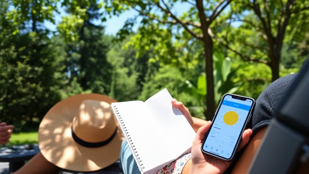 Another practical tip is to vary your outdoor activities throughout the day. For example, spend some time outside in the morning or late afternoon when the sun’s rays are less intense, reducing skin damage risk while still supporting vitamin D production. Use UV index reports to gauge daily sunlight strength, and plan your outdoor time accordingly. Additionally, understanding city and regional climate factors can help you optimize your sun exposure routine and reduce risks. By consistently tracking your sun exposure and implementing skin protection strategies, you can enjoy the benefits of sunlight—like improved mood and vitamin D levels—while minimizing risks. This balanced approach ensures you maintain a healthy relationship with the sun, keeping your skin safe and your body well-nourished by natural light.