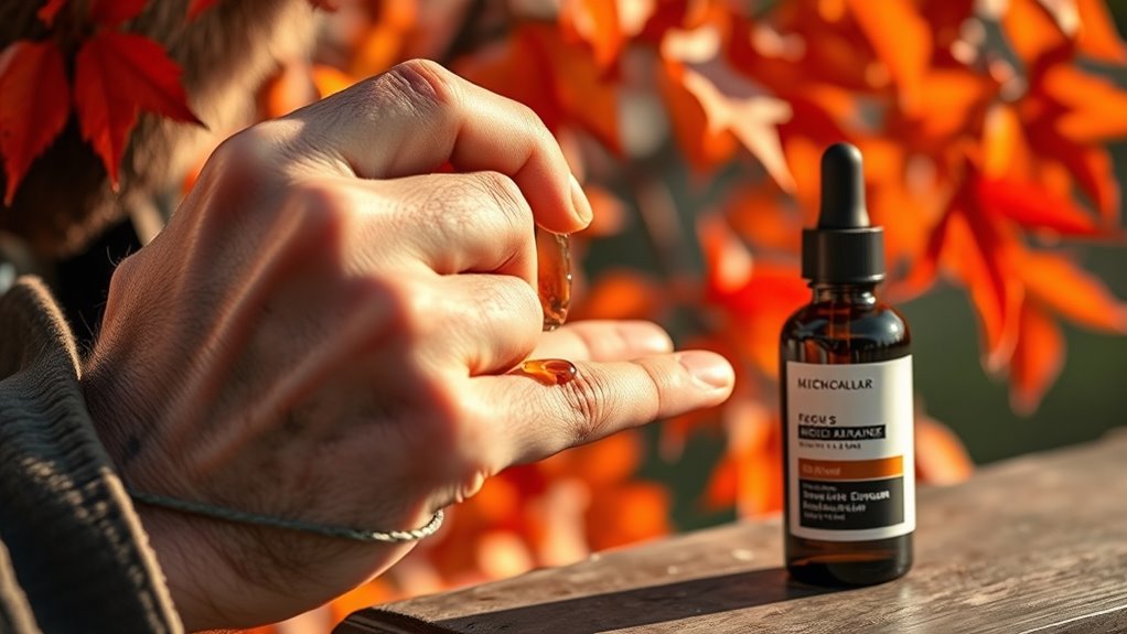 Imagine your skin as an autumn leaf, vulnerable yet resilient. In fall, look for hydrating ingredients like hyaluronic acid and glycerin to lock in moisture. Antioxidant benefits from vitamin C or green tea protect against daily environmental stressors. These ingredients strengthen your skin’s defenses, making it ready for cooler days. Incorporating them into your routine helps you stay energized, protected, and looking sharp all season long.