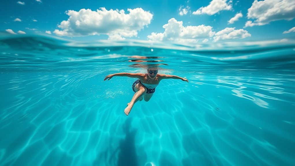 When you swim near the water’s surface, reflections can considerably impact your perception and performance. As light hits the water, it bounces and creates shimmering, mirrored images that can be mesmerizing or confusing. This phenomenon often leads to visual distortion, where your brain struggles to interpret what’s real versus what’s reflected, making it harder to gauge distance, position, or even your stroke technique. If you’re not prepared, these illusions can cause you to misjudge how close objects or other swimmers are, potentially leading to collisions or inefficient movements.