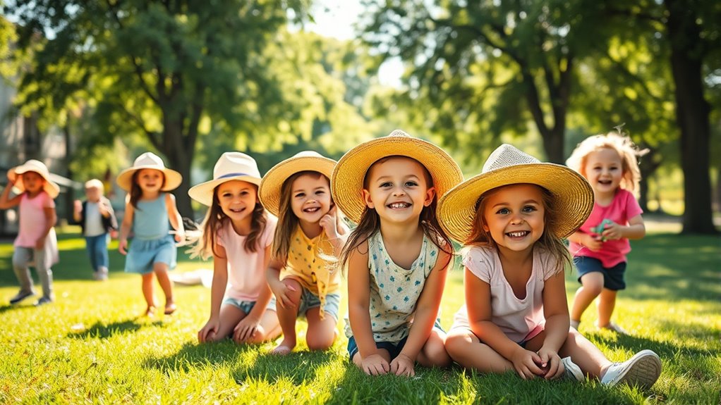 To balance sun exposure and safety for your child’s vitamin D, make certain they get 10-15 minutes of direct sunlight on face, arms, or legs a few times weekly, especially during sunnier months. Use protective gear and avoid peak hours to prevent skin damage. Incorporate vitamin D-rich foods like fatty fish and fortified products into their diet or consider supplements if needed. Keep exploring for more tips on how to support your child’s health safely.