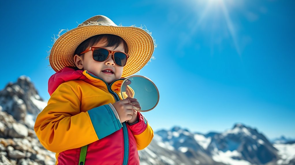As you step into high-altitude sunlight, remember that your child’s delicate skin is like a fragile flower under a blazing sun. Shield them with protective clothing, sunscreen, and hats, creating an invisible shield that reflects dangers away. Think of yourself as a guardian, wielding a shield of awareness and care, ensuring their safety amidst the radiant yet risky sky. By taking these steps, you paint a protective canvas, safeguarding their innocence under the vast, shining sky.
