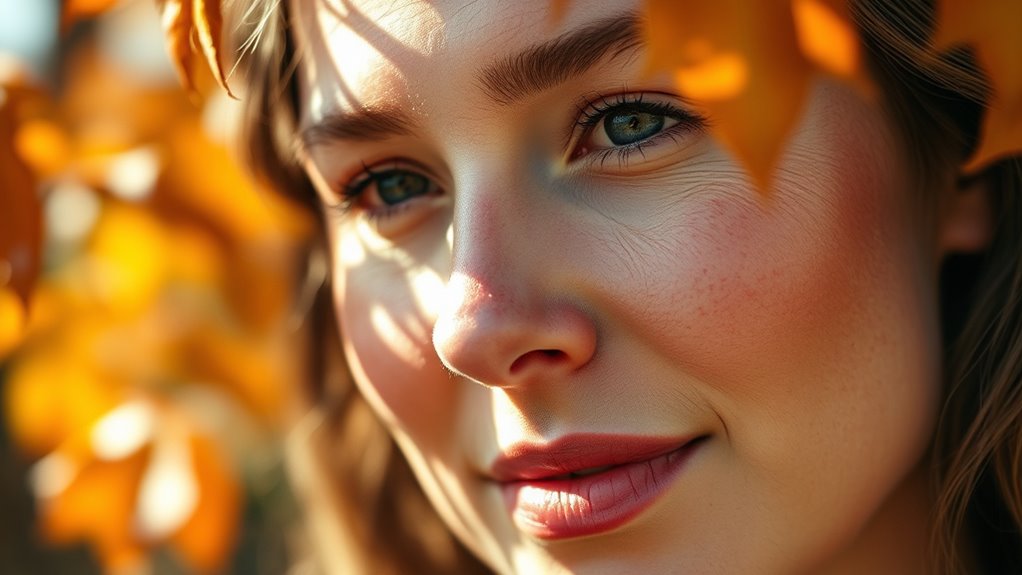 To prevent skin dryness during autumn, you should adopt seasonal skincare and focus on hydrating routines. Use a gentle cleanser to avoid stripping moisture, and apply a rich moisturizer that locks in hydration. Incorporate serums with hyaluronic acid to boost moisture levels, and don’t forget to use sunscreen daily. Drinking plenty of water and avoiding hot showers also help maintain your skin’s natural barrier, keeping it soft and healthy all season long.