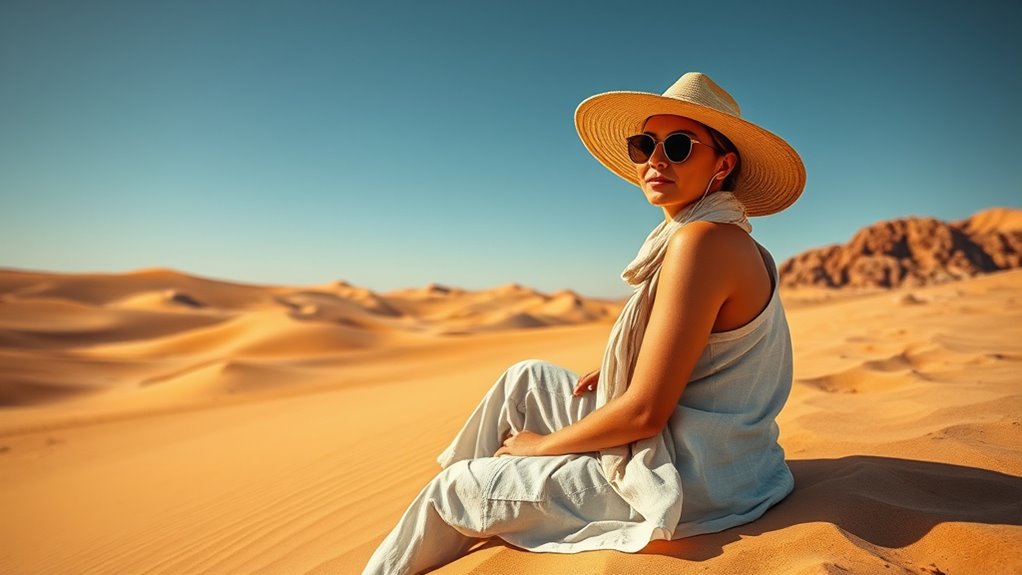 You should also be mindful of the timing and duration of your sun sessions. Avoid peak hours when the sun is at its strongest—typically between 10 a.m. and 4 p.m.—to minimize the risk of burns. Instead, opt for early morning or late afternoon tanning, when the sun’s rays are less intense. Cover your skin with protective clothing, such as wide-brimmed hats and lightweight, long-sleeved shirts, to shield yourself from direct sunlight. Seek shade periodically to give your skin a break and reduce cumulative UV exposure. Remember, even on cloudy days, UV rays can penetrate and cause damage, so consistent sun protection remains essential. By combining vigilant sun protection with effective hydration strategies, you can enjoy your time in the desert while safeguarding your skin from the harsh effects of dry heat.