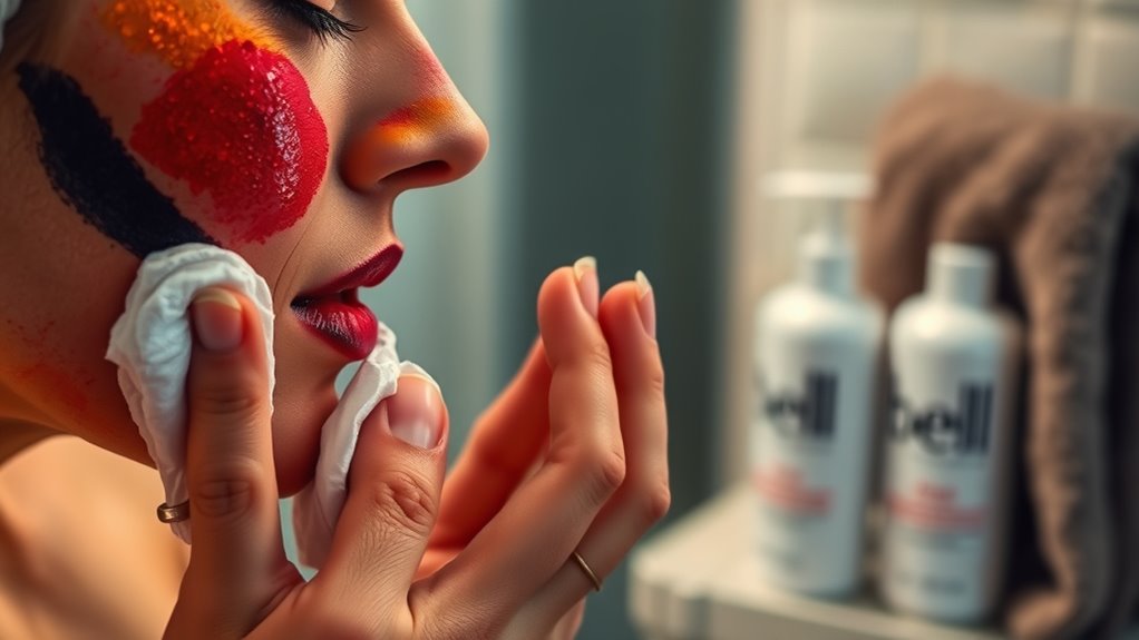 To remove costume makeup safely after Halloween, start with a gentle cleanser suited to your skin type, like micellar water or cleansing oil, and take your time to thoroughly cleanse your face, especially around your eyes and mouth. Follow up with a hydrating toner and a nourishing moisturizer to restore moisture lost during wear. Incorporate calming ingredients like aloe vera or chamomile if your skin feels sensitive. Keep your skincare routine gentle—more tips to help your skin recover quickly are ahead.