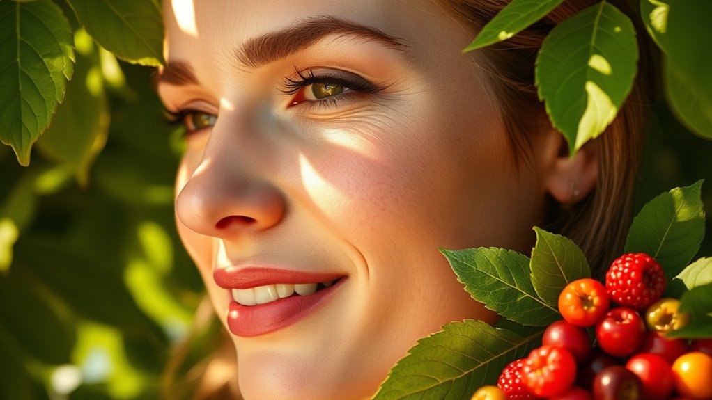 You should focus on antioxidants like vitamin C, vitamin E, and polyphenols, as they are most effective for skin recovery. These antioxidant types support your skin’s repair mechanisms by neutralizing free radicals caused by sun exposure. Applying topical forms or consuming foods rich in these antioxidants boosts your skin’s ability to repair damage, reduce inflammation, and promote healing, helping your skin recover faster after sunlight exposure.