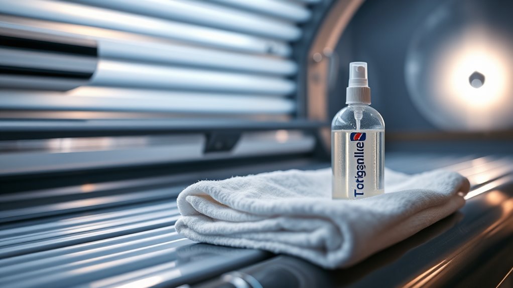 Imagine shining a mirror, spotless and gleaming—that’s how your tanning bed should look. Use EPA-registered disinfectants and proven cleaning agents to guarantee thorough disinfection. Effective disinfection techniques include spray-and-wipe methods with hospital-grade disinfectants and UV sterilization. Avoid harsh chemicals that damage surfaces. Regularly clean all surfaces, especially high-touch areas, to prevent bacteria and fungi buildup. Proper sanitation keeps your clients safe and your equipment in top condition.