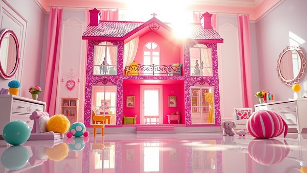 Before choosing a Barbie Dreamhouse deal, it’s essential to gauge your available space to guarantee it fits comfortably. Measure your room, doorways, and hallways to ensure easy transportation and setup. Think about where the dollhouse will go and whether a larger, multi-room model or a compact design suits your needs better. Check the dimensions to confirm it can be stored easily when not in use, especially if space is limited. Consider how many children might play simultaneously; a bigger dollhouse can accommodate multiple kids without feeling cramped. Taking these size and space factors into account helps you select a Dreamhouse that fits seamlessly into your home and provides a fun, functional play area for kids.