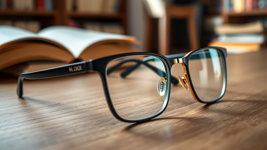Selecting blue-light–blocking reading glasses with durable materials is essential because they can withstand daily wear and tear without breaking or cracking. Look for frames made from TR90, polycarbonate, or high-quality plastic, which offer strength and longevity. Check that the lenses have scratch-resistant coatings and a sturdy mounting, ensuring they endure cleaning and everyday use. Consider hinge design too; spring hinges provide flexibility and reduce stress on the frame, preventing breakage. The weight and feel of the glasses matter as well—lightweight yet solid materials enhance comfort and reduce fatigue during long hours of wear. Finally, evaluate the overall build quality, including reinforced nose pads and sturdy temple arms, which can handle frequent adjustments and daily handling without damage.