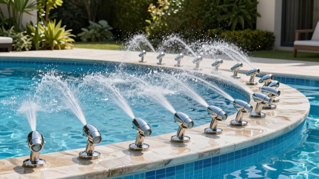 Deck jets offer a stunning way to enhance your pool’s ambiance with various visual effects, from elegant water arcs to cascading waterfalls. The adjustable nozzles let you customize the flow’s angle, height, and width, helping you achieve the perfect look for your space. Multi-hole or triple-stream jets create more intricate fountain displays, adding sophistication and movement to your pool. The size and shape of the jet openings directly influence the size and form of the water arcs, impacting the overall aesthetic. For nighttime magic, many deck jets can incorporate lighting features, transforming your pool area into a mesmerizing visual spectacle after dark. Considering these options allows you to tailor your pool’s look to match your style and create a captivating environment.