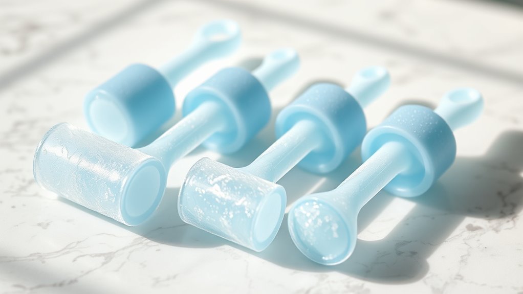 Choosing the right ice roller for your face starts with paying close attention to the materials used. I look for high-quality, BPA-free silicone or medical-grade materials to guarantee safety and prevent skin irritation. It’s important that the material is durable and resistant to cracking or warping after repeated freezing and use, so my tool stays reliable over time. I also check that the surface is smooth and free of rough edges, which helps avoid scratching or damaging my skin. Easy-to-clean materials are essential for maintaining hygiene and extending the lifespan of the roller. Most importantly, I confirm the materials are non-toxic and free from harmful chemicals, ensuring safe contact with my skin during every use.