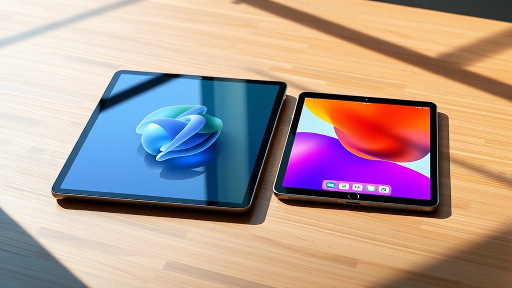 Choosing between the iPad Pro 2025 and the iPad Air depends on what you need. The Pro offers top-tier performance, a larger display, and better multitasking for demanding tasks, but it’s pricier and less portable. The Air balances good power with portability and affordability, making it great for most students. If you want to find out which model fits your study style best, keep exploring—more details are ahead.