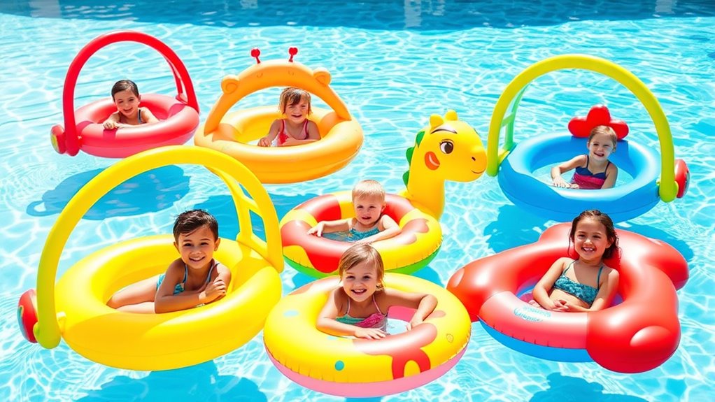 If you’re looking for the best kids’ pool sunshade floats, I’ve got you covered. These floats combine safety features like adjustable harnesses, mesh sides, and secure seats with fun designs and UPF 50+ sun canopies for extra protection. They’re made from durable, eco-friendly materials and offer stability for active little swimmers. Whether your child loves pirates, princesses, or ocean animals, there’s a perfect option here. Keep going to explore all the top picks for safe, sunny swimming fun.