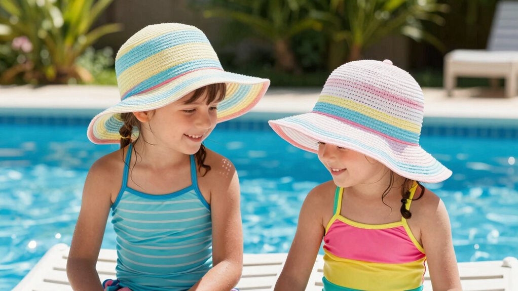 Getting the right fit is key to guaranteeing your child’s sun hat provides effective protection and comfort during pool days. To do this, match the hat size to your child’s head circumference for proper coverage. Adjustable hats with chin straps or drawstrings are great because they can grow with your child and stay secure. Keep in mind that sizes vary greatly for infants, toddlers, and older kids, so choosing a hat designed for their specific age group makes a difference. Always check the manufacturer’s size chart to guarantee an accurate fit based on age and head measurements. Additionally, hats made from flexible or stretchy materials can provide extra comfort and adaptability, ensuring the hat stays snug without being too tight as your child moves and grows.