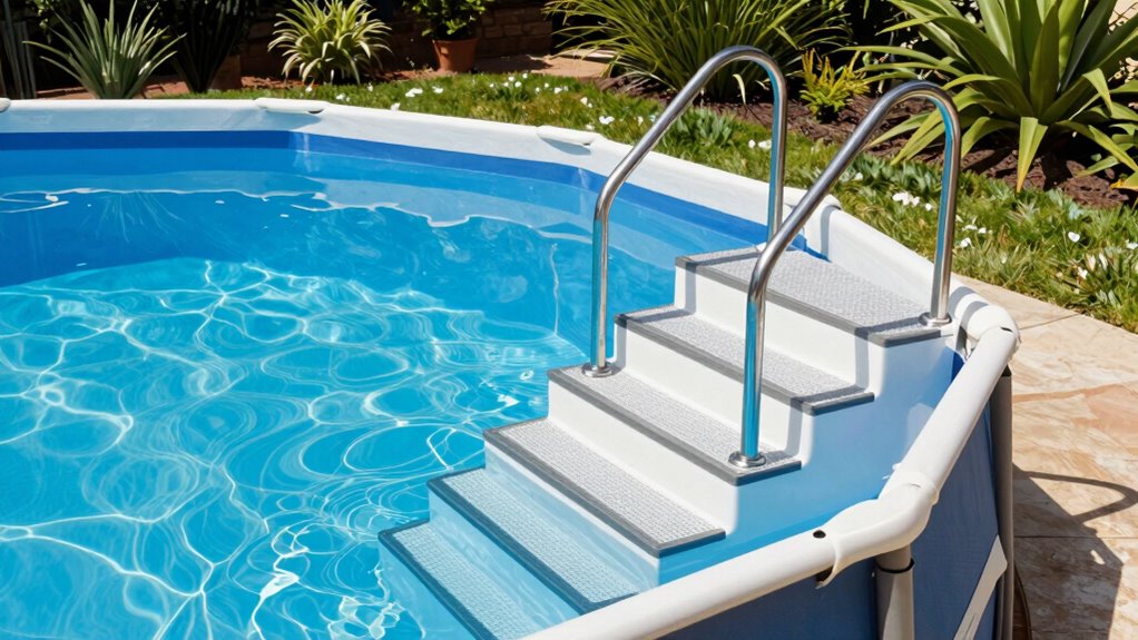 Have you ever considered how vital safety features are when selecting pool stairs for your above ground pool? These features, like non-slip steps and sturdy handrails, drastically reduce the risk of slips and falls during entry and exit. Lockable gates and barriers are essential for preventing unauthorized access, especially for children. Well-designed safety elements ensure stability and support for users of all ages and sizes, minimizing accidents. Anti-slip textured surfaces on steps provide secure footing even when wet, boosting safety during use. Adjustable or customizable safety features also help guarantee a proper fit and secure installation, reducing hazards caused by improper setup. Prioritizing safety features protects everyone and makes pool time more enjoyable and worry-free.