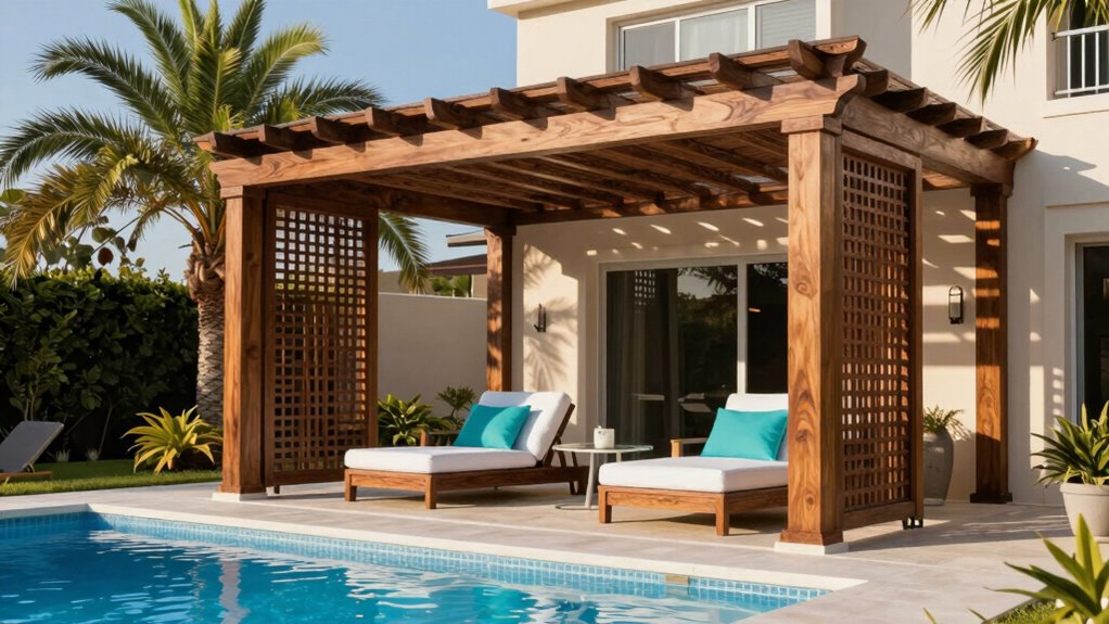Choosing a poolside pergola kit isn’t just about functionality; it’s also about how well it complements your outdoor decor. I look for designs and colors that match my existing furniture and style to create a cohesive look. Material choices like cedar or aluminum should align with my outdoor aesthetic, whether rustic or modern. The overall style of the pergola—be it traditional, rustic, or contemporary—needs to fit seamlessly into my landscape. I also consider matching the color and finish of the pergola with other outdoor accents like planters, lighting, or furniture. Additionally, design features such as trellis panels or decorative brackets should harmonize with the surrounding landscape, enhancing the overall visual appeal. A well-matched pergola elevates the entire outdoor space.