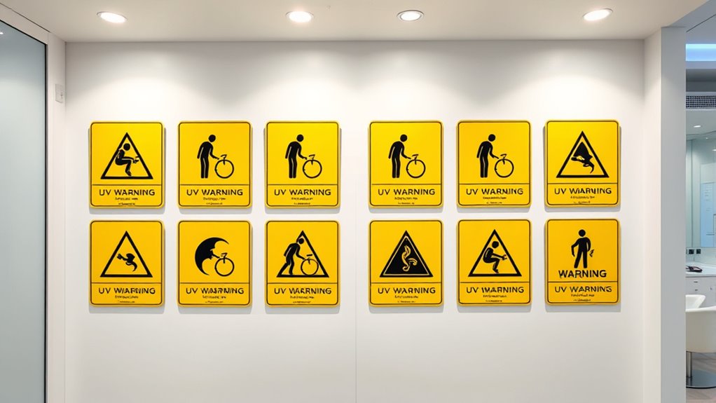 You’re wondering if UV warning signs comply with local safety regulations, and I can tell you it varies by location. I always recommend checking your local health and safety codes because regulations often specify the wording, size, and placement of signs. Using compliant signs not only protects your clients but also keeps you legally covered. I suggest consulting local authorities or safety standards to guarantee your signage meets all requirements.