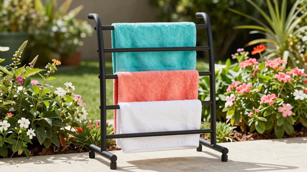 If you’re searching for the 15 best freestanding outdoor towel racks for 2026, I’ve got you covered. I’ve found options that combine durability, weather resistance, and sleek designs, perfect for any outdoor space. These racks feature stable bases, weatherproof materials, and versatile storage options to keep your towels dry and organized. Want to discover more about these top choices? Keep exploring to find the perfect towel rack for your outdoor needs.